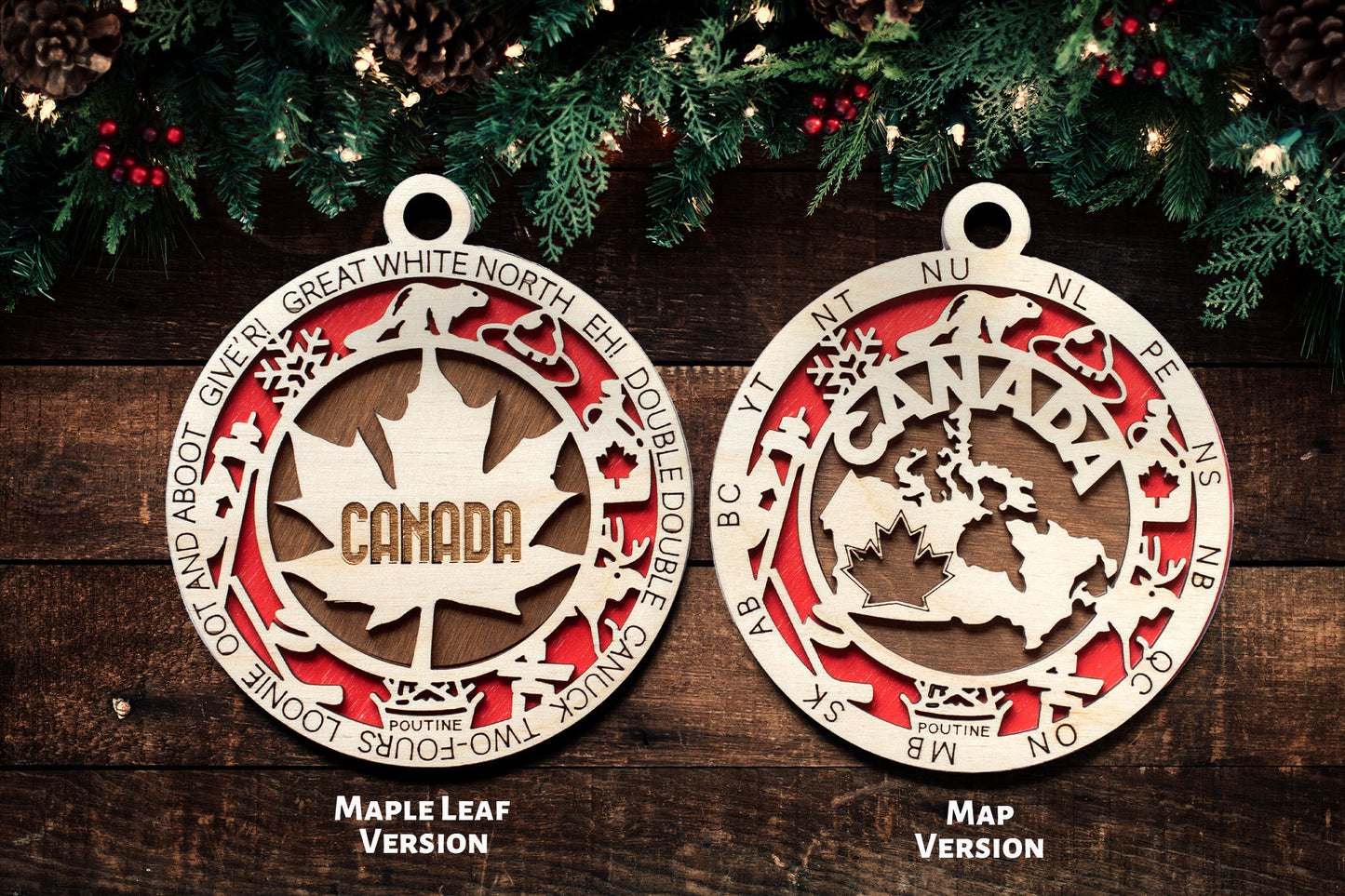 Share some patriotic pride this Holiday Season with a hand crafted Canadian ornament that showcases distinctly Canadian icons and words.
