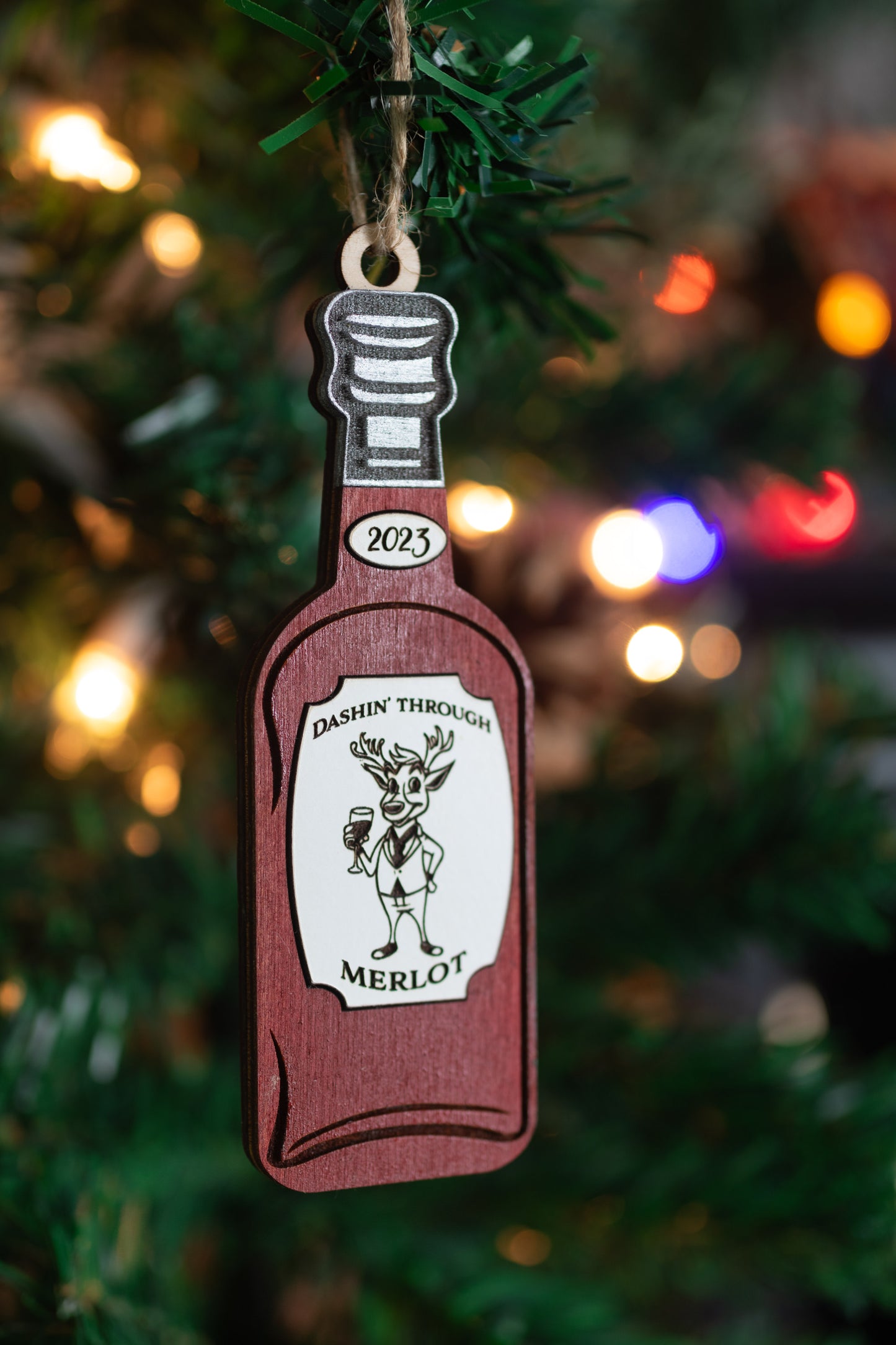 This Santa is kicking off the holiday season early with glass of wine! He's dressed in his full suit and holding a glass of red. Each little wine bottle has engraved details with a raised label.