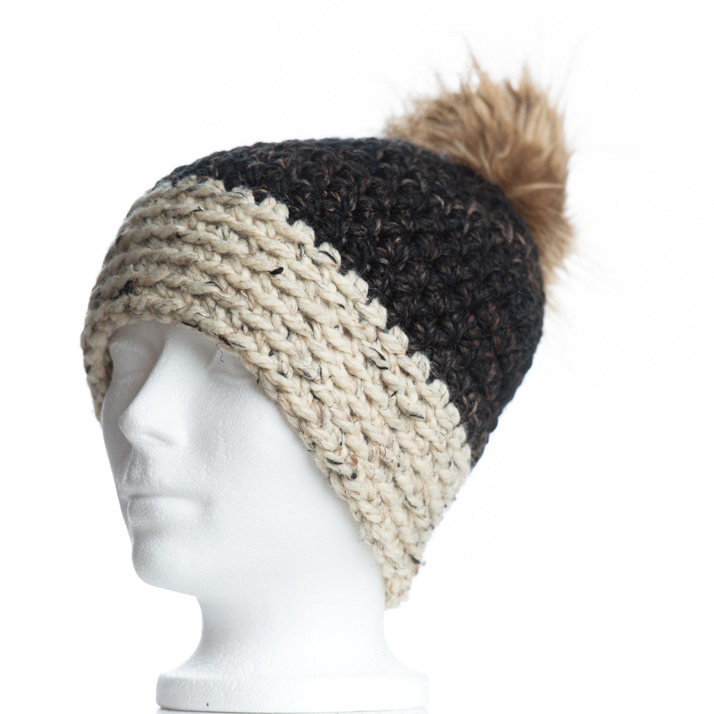 Our 'Faux Fur Two Tone Toque' is made of super bulky yarn and molds the head for a perfect fit that frames the face beautifully and keeps your ears nice and toasty.